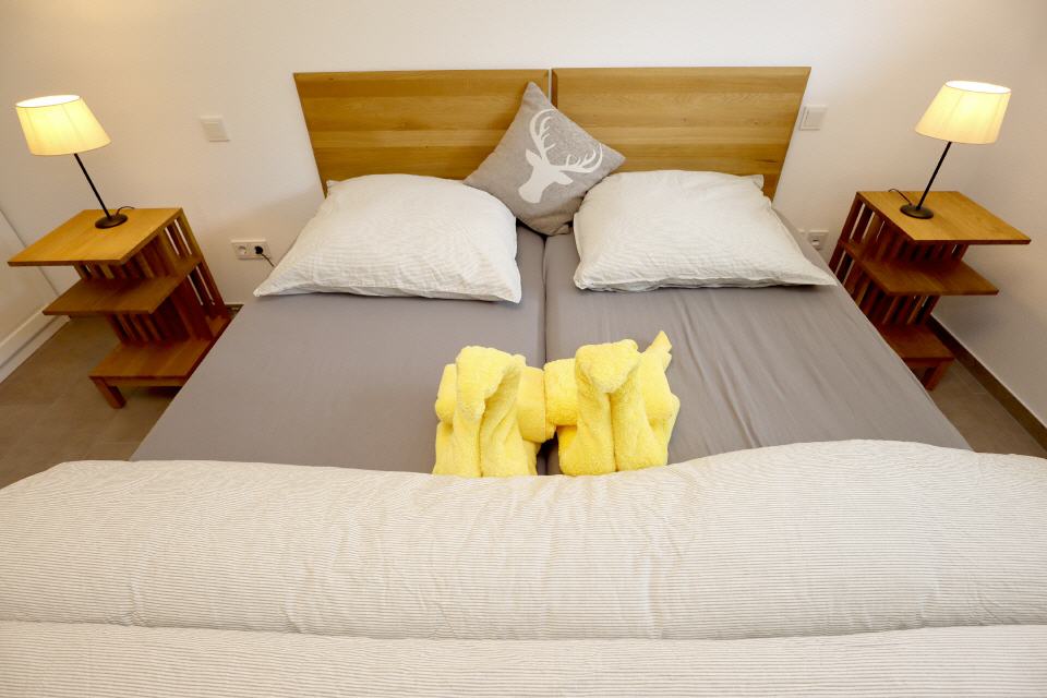 Schlafzimmer mit höhenverstellbarem Komfortbett (Einzel- oder Doppelbett möglich)