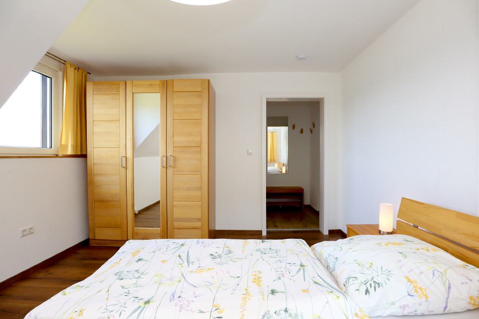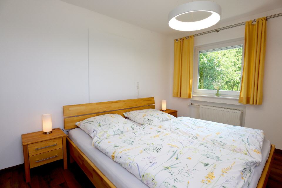 Schlafzimmer: großes Doppelbett (180- 210 cm), Schrank, Nachttischleuchten