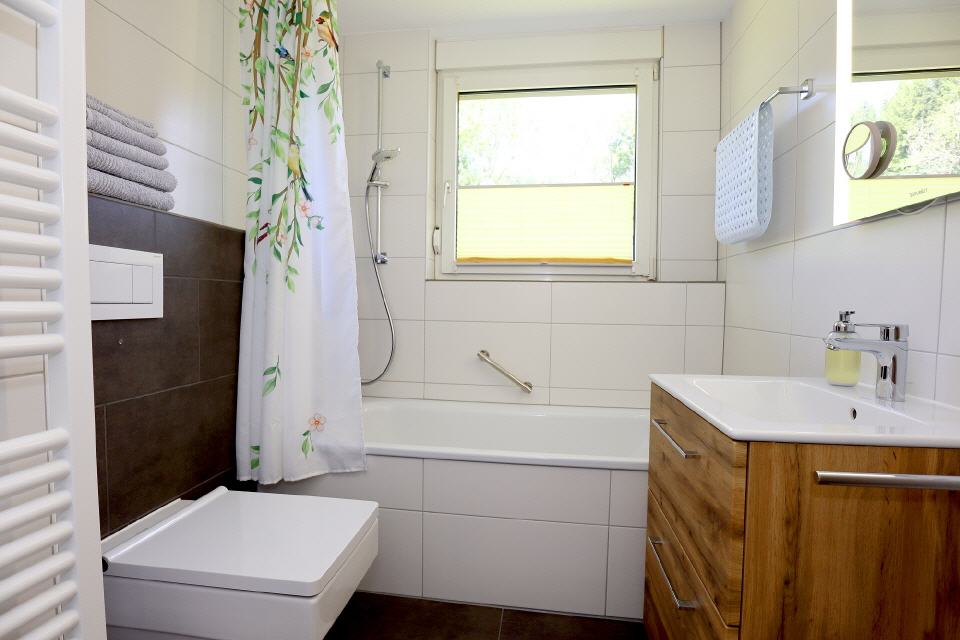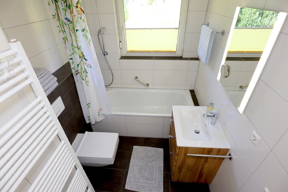 Badezimmer: Fenster, Badewanne,, Haartrockner, kostenlose Pflegeprodukte, Toilettenpapier, WC