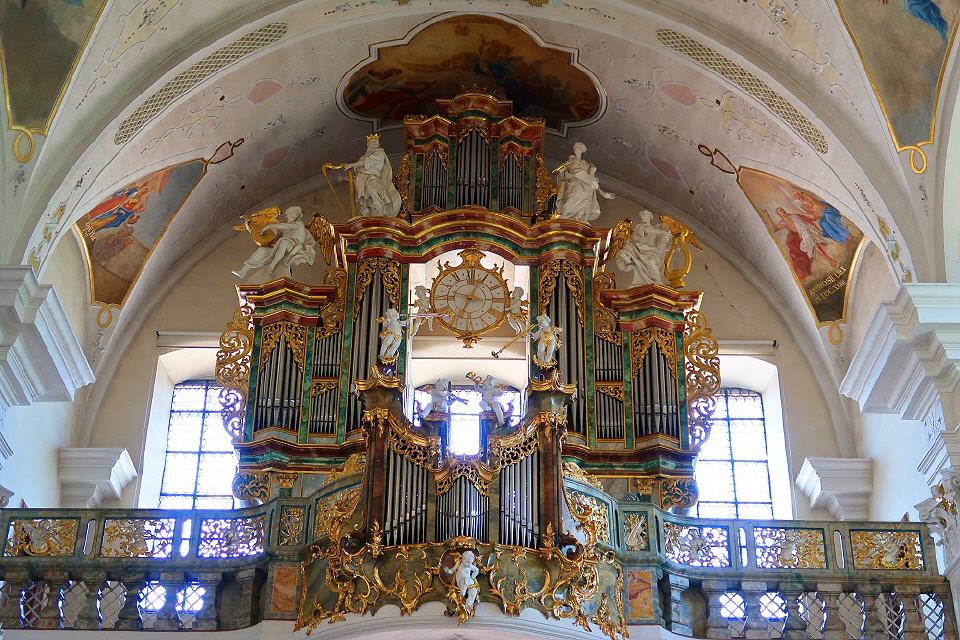 Die harmonische Verbindung des kunstvollen Chorgitters mit den Altären vor dem Chor und dem Hauptaltar findet ihr Pendant an der Westwand der Kirche in der prächtigen Orgelempore mit einem filigranen Gehäuse. Es ist von der Figuren der Patronin der Kirchenmusik, Cäcilia, des königlichen Psalmensängers David und musizierender Engel gekrönt, die beschwingt umeine Uhr von Matthias Faller schweben. Er wirkte als Holzbildhauer in den Klöstern St. Märgen und St. Peter.