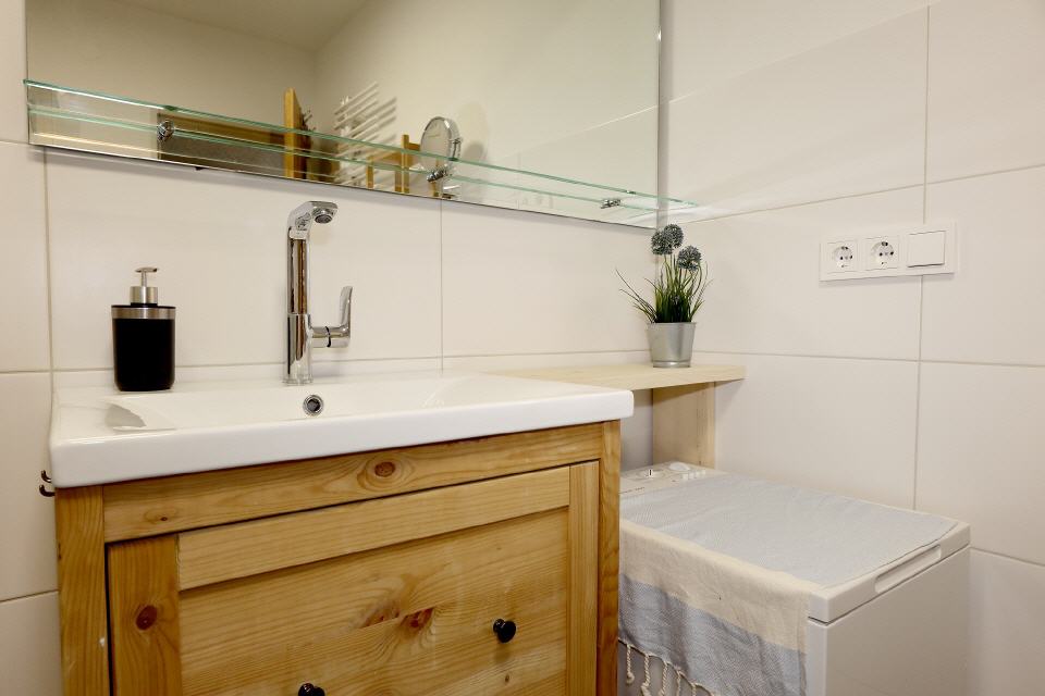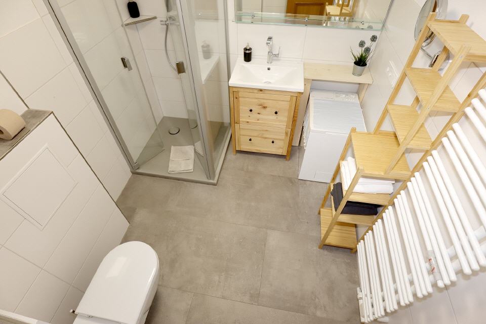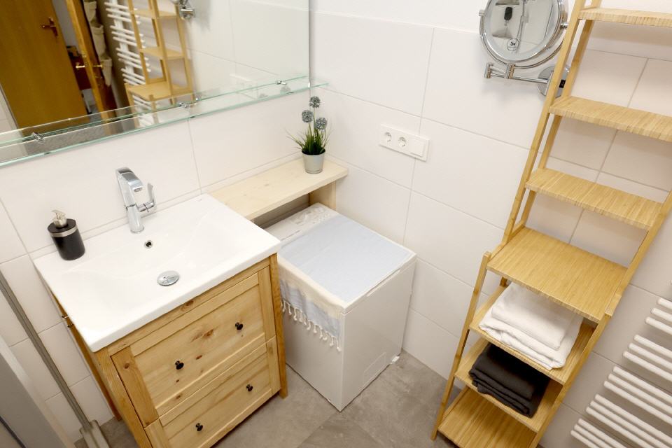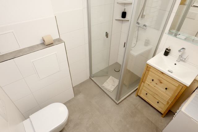 - Sanitär: Waschbecken, Dusche, WC, Spiegel, Fön, Handtücher