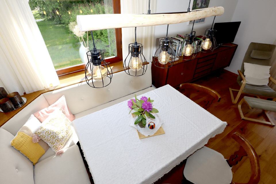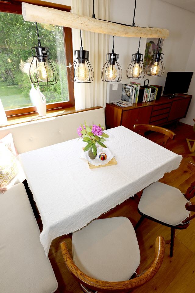 - Wohnen & Essbereich: gemütliche Couch mit Tisch und Sessel, TV, Tisch, Sitzbank mit Tisch und Stühlen, Schrank, Radio