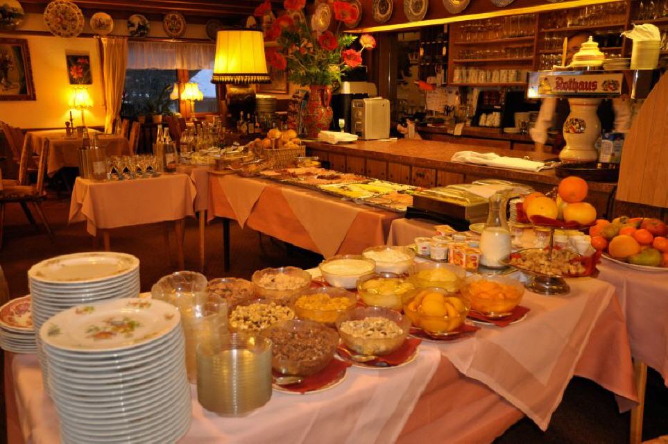Für unsere Hotelgäste bieten wir ein sehr reichhaltiges Frühstücksbuffet mit verschiedenen Wurst- und Käse-Aufschnittplatten, Fisch, Vital Müsli Ecke, unterschiedliche Broet und Brötchensorten sowie Ei- und Milchprodukten, Biosäften und weiteren Produkten aus der Region.