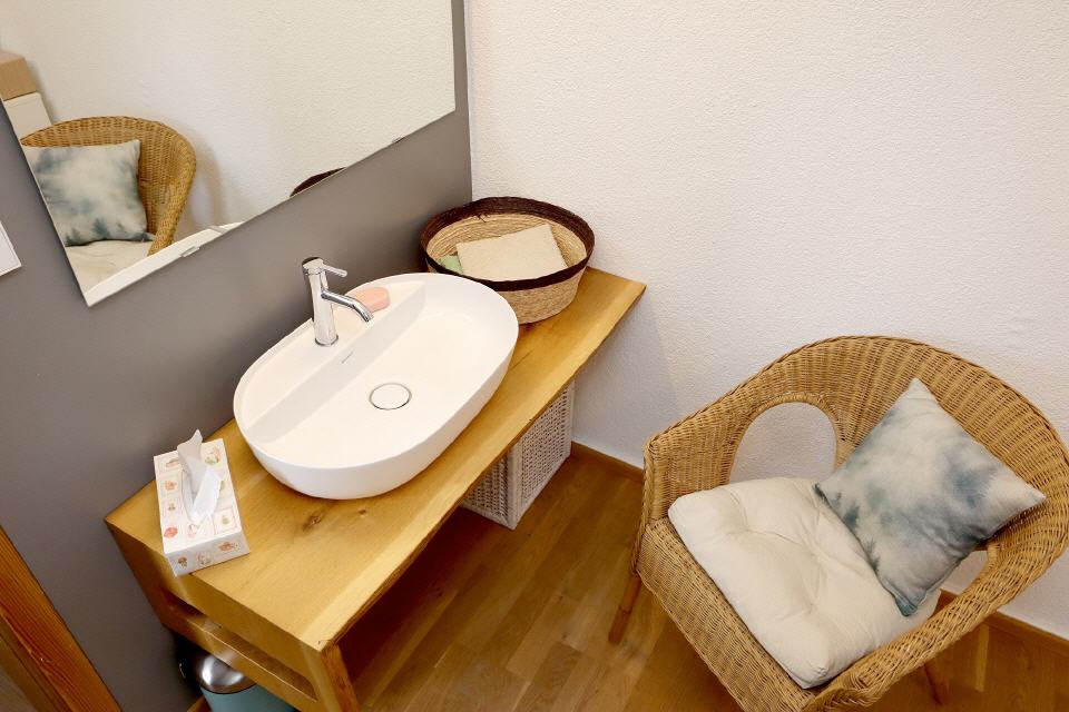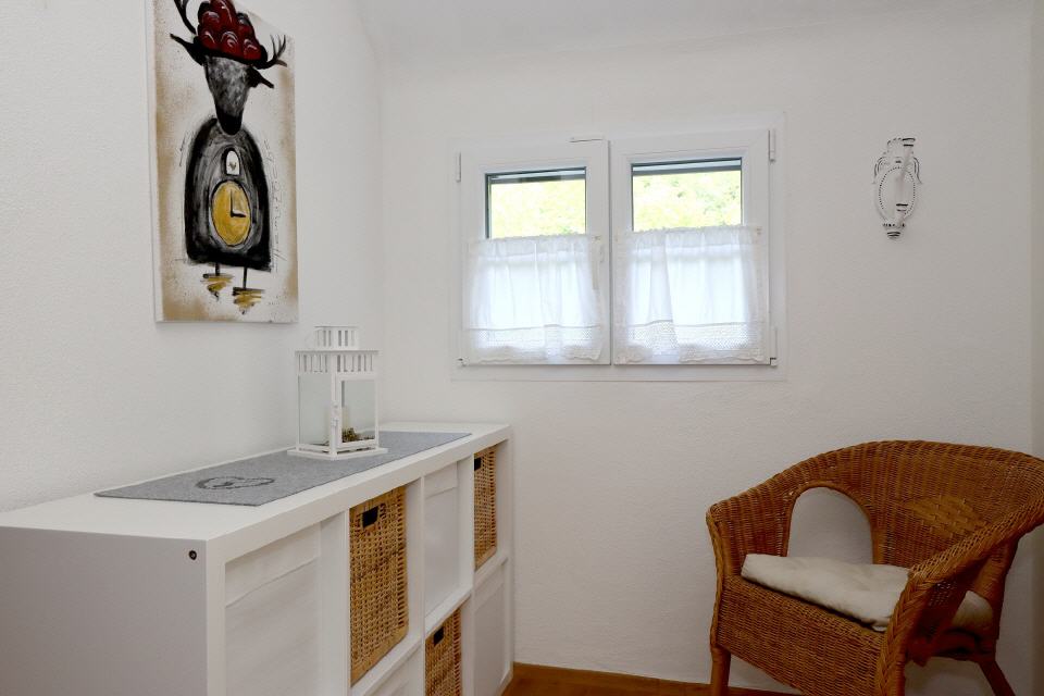 Sie betreten das Haus über eine im Schwarzwald typische Loggia und gelangen in den Eingangsbereich. Sie erkennen gleich: Tradition trifft auf Moderne. Das helle Grau der Fliesen in der Diele sowie das Eichenparkett in den Zimmern fügen sich hervorragend in den Baustil des Hauses ein.
