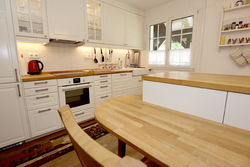 - Kochen: sehr schöne, große Küche mit Tisch und Sitzmöglichkeiten, 4-Plattenherd, Backofen, Ceran-Kochfeld, Dunstabzug, Eierkocher, Gefrierfach, Geschirr und Besteck, Spülmaschine, Kaffeemaschine, Kühlschrank, Mikrowelle, Toaster, Wasserkocher