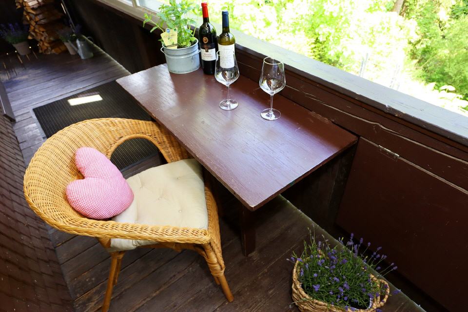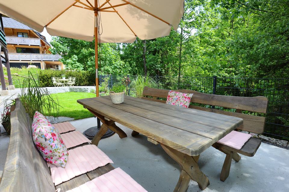- Außenbereich: großer Balkon mit Mobiliar, Garten und Terrasse mit Gartenmöbeln und Grill