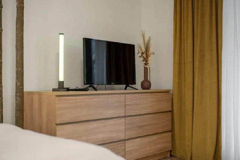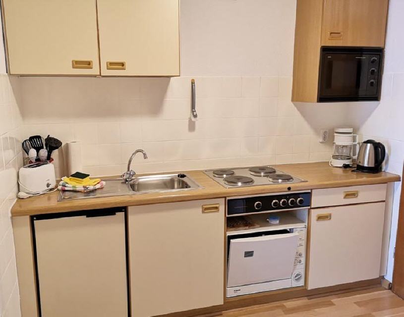 A3 - 1-Raum-Apartment für bis zu 4 Personen: 1 Wohn/Schlafzimmer mit SmartTV Funktion, 1 Doppelbett (160cm), 1 Schlafsofa für 2 Personen/Kinder, Esstisch, 2 Stühle (+2 bei 4 Personen-Belegung), Küche ohne Spülmaschine und Backofen, kleinem Herd, kleiner Kühlschrank, Mikrowelle mit Backfunktion, Wasserkocher, Toaster, Kaffeemaschine, Duschbad mit Fön und Handtüchern, Terasse mit direktem Gartenzugang. Es sind max. ein großer Hund oder zwei kleine Hunde erlaubt. Hunde dürfen keinesfalls auf Sofa oder Bett!