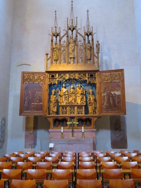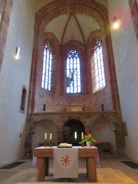 Nach dem Bau eines hölzernen Oratoriums und einer kleinen, 1099 geweihten Steinkirche konnte die jetzt noch bestehende monumentale Klosterkirche errichtet und vermutlich im Jahre 1128 geweiht werden. Das Gotteshaus ist eine dreischiffige, siebenjochige Säulenbasilika mit Flachdecke über dem Grundriss eines lateinischen Kreuzes ohne Krypta. Klare Maße von Quadrat und Halbkreis mit freiem Durchblick ohne Dämmerlicht bestimmen den Raum. Chor, Vierung und Arme des Querschiffes sind quadratisch, die Absiden halbrund. Die Langschiffjoche werden von Monolithsäulen mit Würfelkapitellen getragen. Ein Gotteshaus, das bis auf geringe gotische Veränderungen verschont blieb und lange Zeit als Grablege adliger Geschlechter diente. So darf Alpirsbach mit Fug und Recht als Juwel hochromanischer Baukunst gelten, das seinesgleichen sucht.