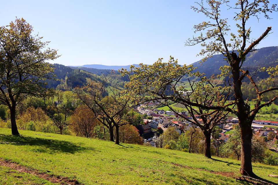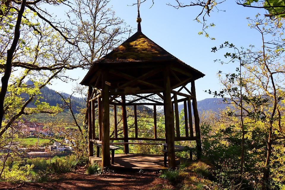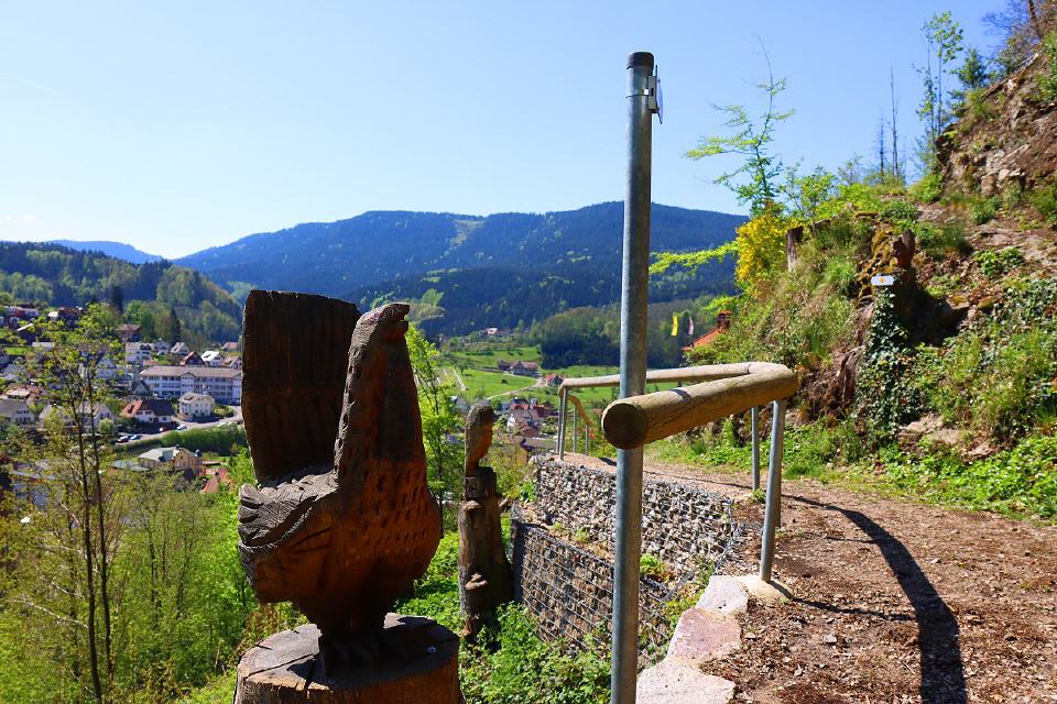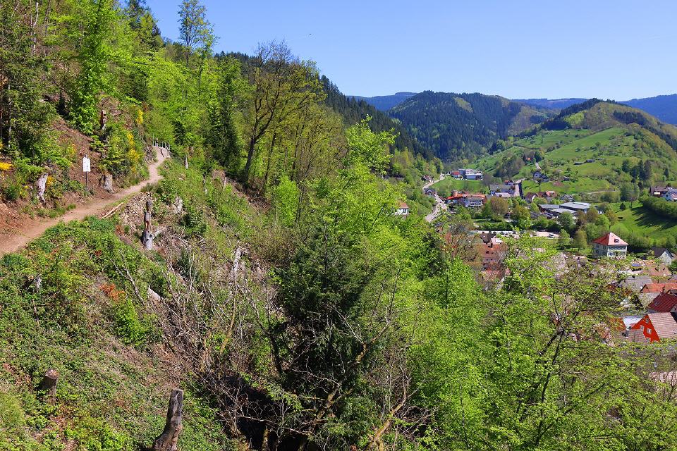 Zurück marschiert man weiter bis zur Turnerhütte, um dem Weg über eine Wiese bis zu den Rieseneiern zu folgen. Vorbei an der Friedenseiche gelangt man zum Pavillon am Scheibenfelsen. Ein kleiner Pfad bringt die Ausflügler hinunter zur Kletthütte. Von dort aus genießt man einen weiten Blick auf die Kirche und aufs Städtchen Oppenau.