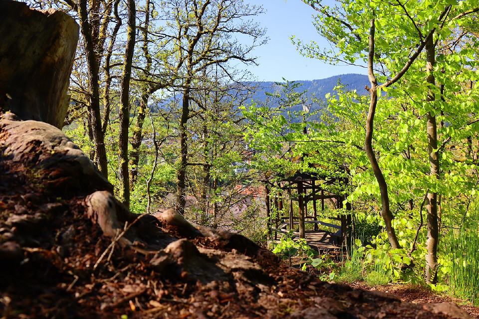 Von hier aus geht's weiter, vorbei an der Friedburg bis zum Katzenbuckelpavillon. Hat jemand die Katze entdeckt? Nun führt der Pfad weiter an buten Vogelhäuschen, vorbei zum Schlossgrund. Folgen Sie nun dem neuen Weg durch die Furt über die Brücke und immer weiter hinaus, bis man auf der Kleinebene ankommt. Von hier aus erreicht man einen Spielplatz mit einem tollen Fotorahmen, wo ein schönes Erinnerungsbild (oder Selfie?) geschossen werden sollte.