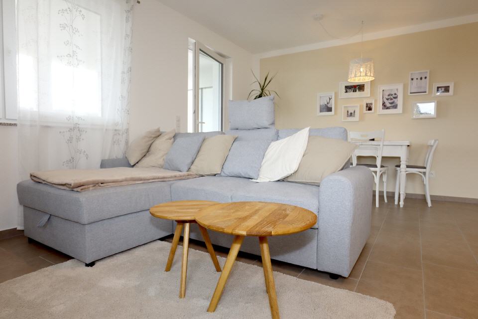 Großes Wohnzimmer mit Schlafsofa, TV und Stereoanlage