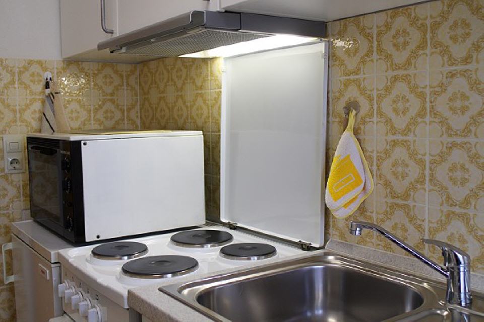 Küche: Einbauküche, 4-Plattenherd mit Backofen, Dampfabzug, Kühlschrank mit Gefrierfach, Spülmaschine, Mikrowelle, Kaffeemaschine, Wasserkocher, Toaster, Eierkocher, Brotmaschine, Speiseservice für 8 Personen