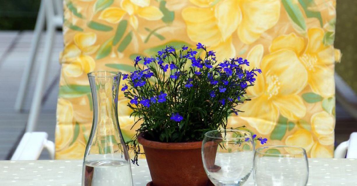 Der Garten mit großer Liegewiese bietet sowohl schattige als auch sonnige Plätze zum relaxen. Die große Terrasse an der Südseite ist ein besonderer Blickfang des Hauses. Schon am Morgen kann man sich im Garten auf der Frühstücksterrasse sein Frühstück vom Buffet schmecken lassen.