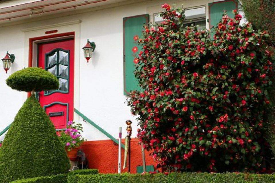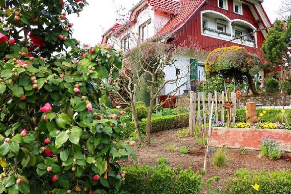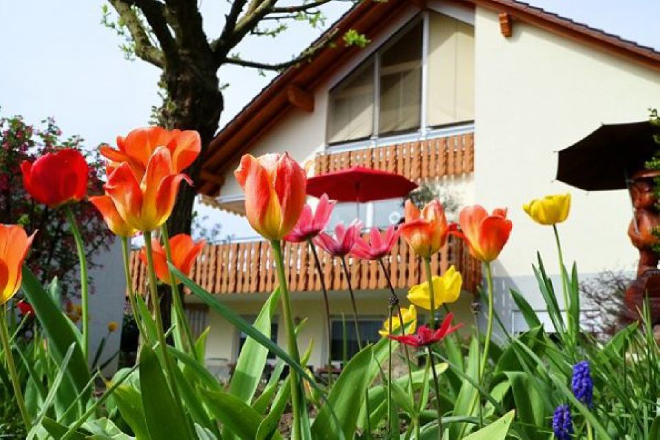 Gepflegte Fachwerkhäuser mit geraniengeschmückten Gesimsen und Balkonen, zahlreiche alte bepflanzte Brunnen und Tröge und üppig blühende Vorgärten ergänzen das idyllische Bild der Landschaft.