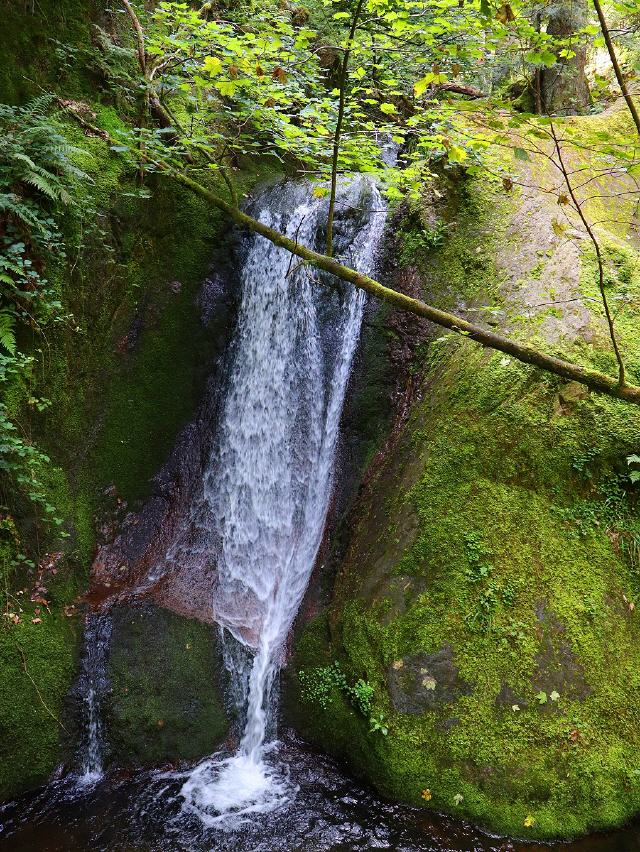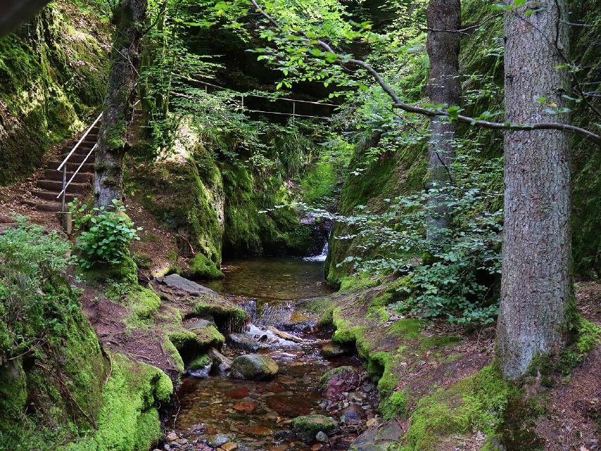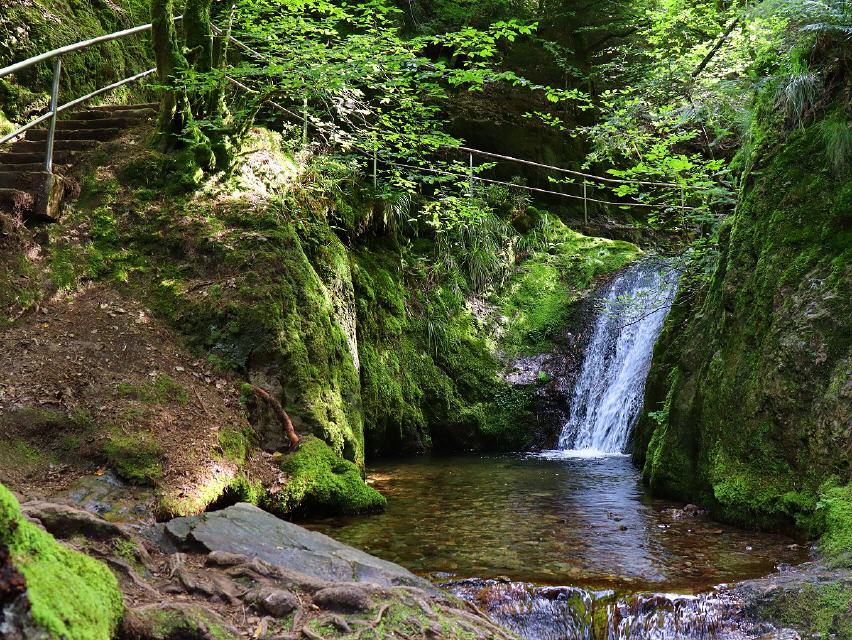 Vom Rabenfelsen aus führt der Wanderweg zunächst an einem Streuobstfeld mit Kirschbäumen entlang, zum Denkmal des 110. Badischen Reserve-Infanterieregiments und nach wenigen Metern zum Wanderparkplatz „Blöchereck“. Hier folgen wir der Gemeindestraße „Gottschläg“, bis die Wegmarkierung darauf hinweist, die Straße zu verlassen. Dort beim so genannten „Richard-Bernhard-Blick“ oder auch „Sattel“ genannt, führt der Wanderweg in einigen Serpentinen einen schmalen Waldpfad hinab und wir gelangen zum nächsten Wegweiserstandort „Gottschlägtal“. Jetzt befinden wir uns oberhalb der sagenumwobenen Edelfrauengrab-Wasserfälle.