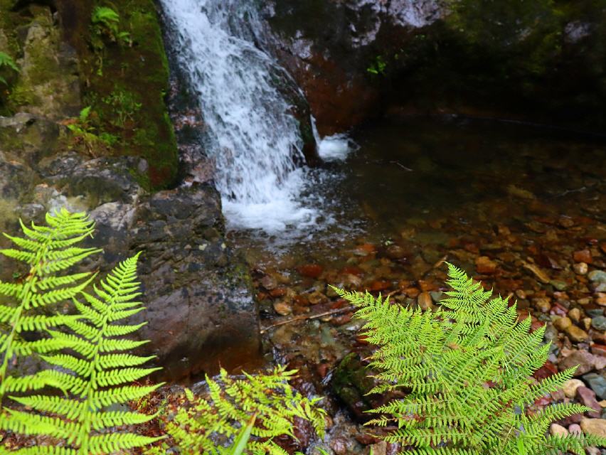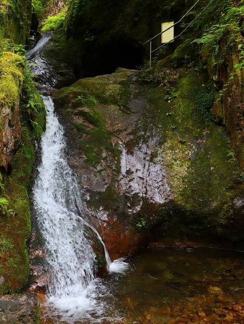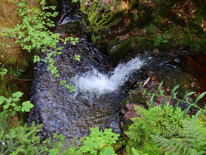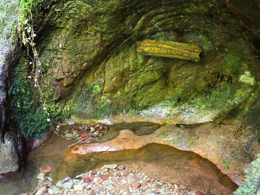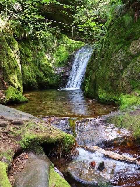 Wir halten uns aber in Richtung Edelfrauengrab, kommen nach wenigen Minuten zum „Romantischen Brückle“ und befinden uns beim so genannten „Degler-Bad“ schon im Bereich der oberen Wasserfälle. Der Gottschlägbach bildet in diesem Abschnitt mehrere bis zu acht Meter hohe Wasserfälle und überwindet auf kurzer Strecke einen Höhenunterschied von mehr als 100 Metern. Innerhalb der Wasserfälle bietet sich ein kurzer Abstecher zum eigentlichen Edelfrauengrab an, wo auf einer Hinweistafel die Sage um den Ritter von Bosenstein und seiner Ehefrau geschildert wird.
