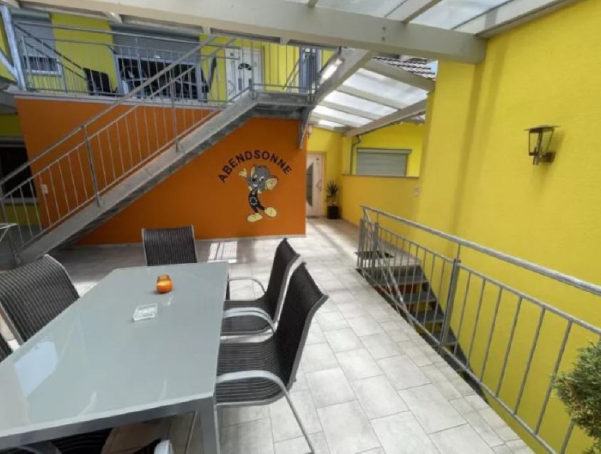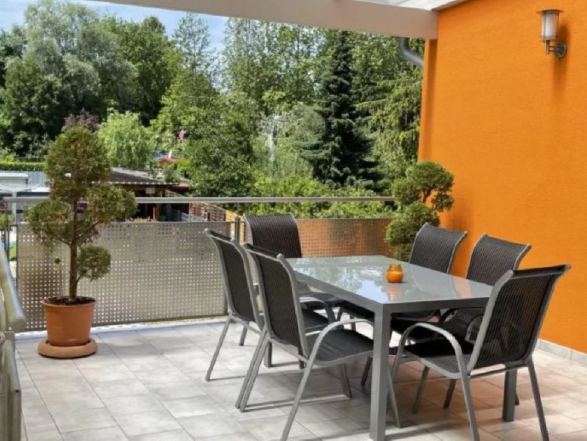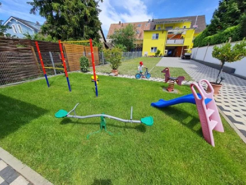 Sie liegt im EG und hat im Garten einen überdachten Freisitz mit Spielplatz für unsere kleinsten Gäste.