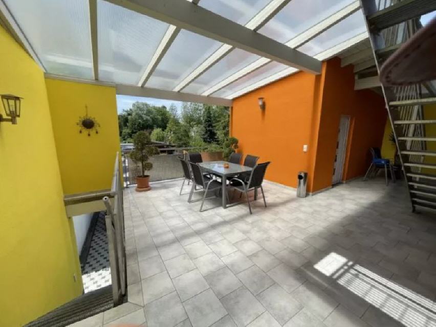 Sie liegt im 1. OG und hat einen kleinen Balkon. Man kann jedoch auch gerne im Garten den überdachten Freisitz nutzen.