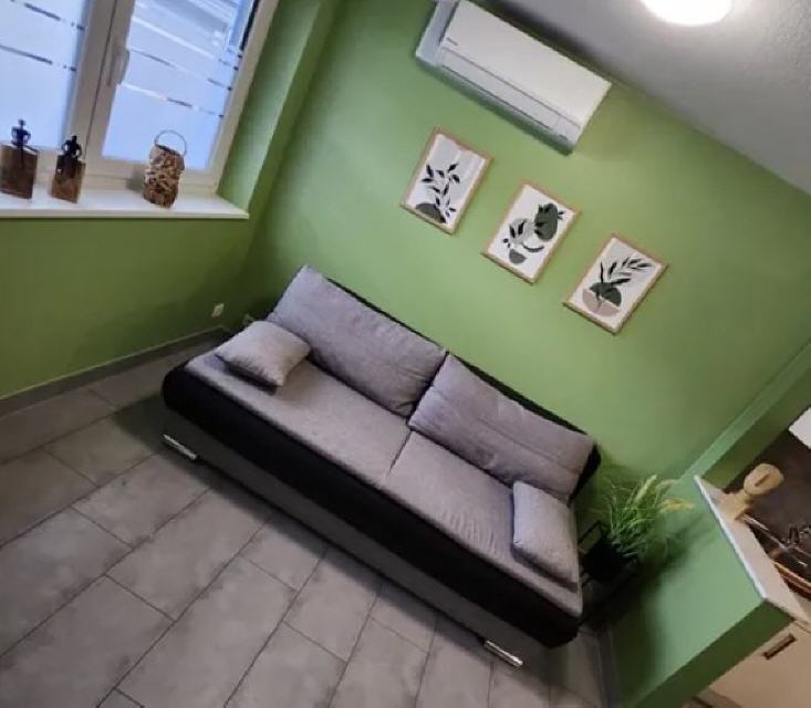 Außerdem befindet sich im Wohnzimmer eine Schlafcouch.